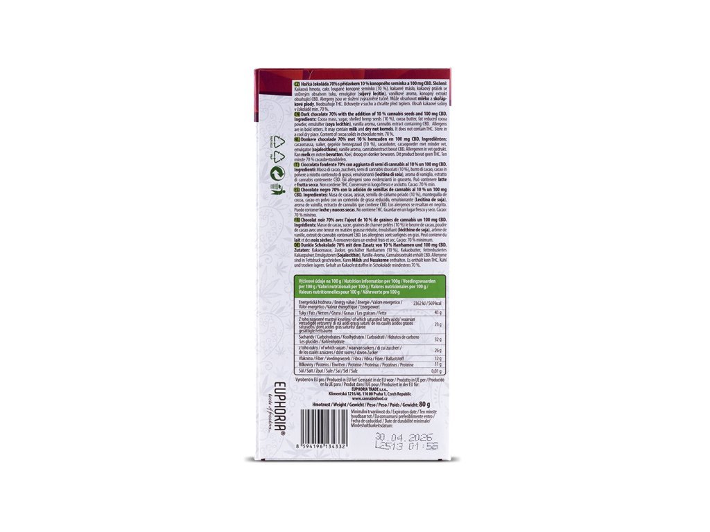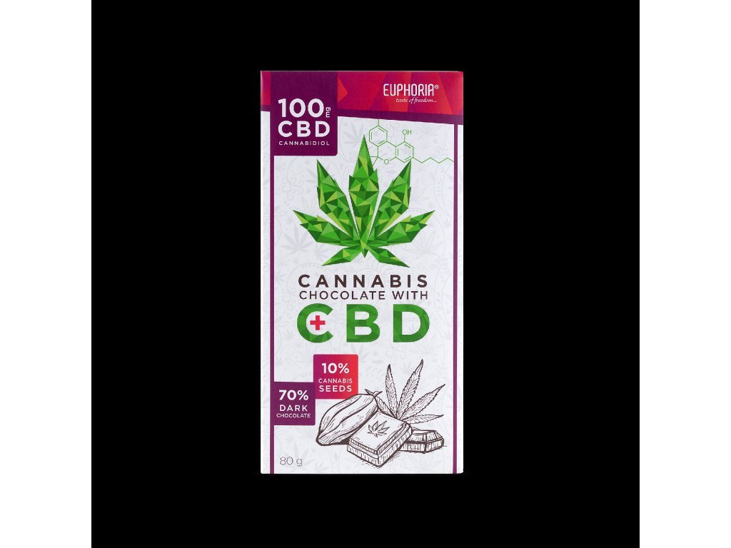 Euphoria Hořká konopná čokoláda se 100 mg CBD a semínky Cannabis Sativa L. 70% Hořká čokoláda s konopným nádechem – bez THC Tato výjimečná 70% hořká čokoláda je vyrobená v České republice.