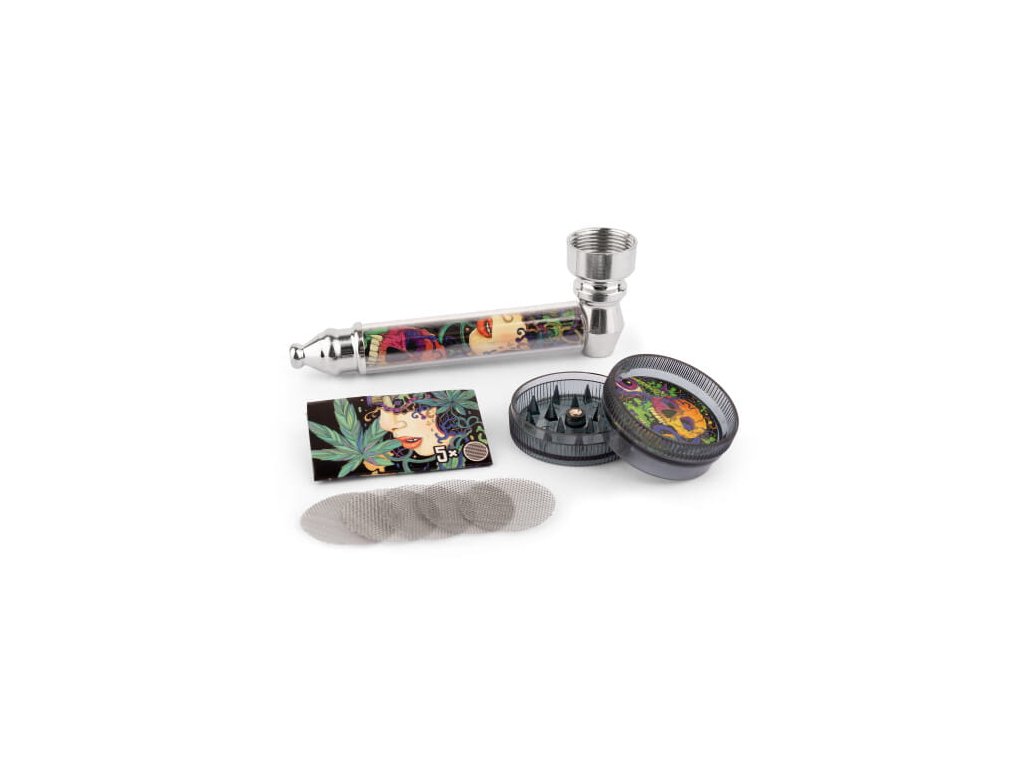 Kompaktní sada typu „vše v jednom“, obsahující kovovou dýmku, mini mlýnek a sítka pro dýmku. Navrženo s ohledem na snadné použití a každodenní používání.