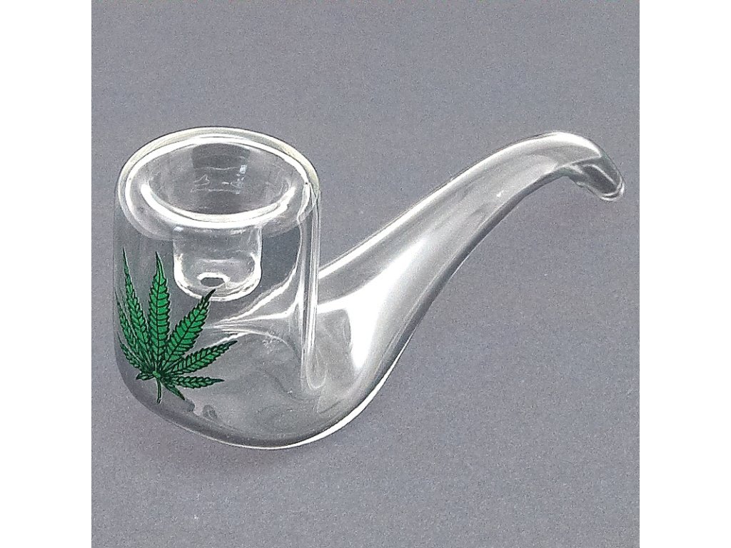 Výborná šlukovka z odolného tvrzeného skla duran s velkým zahnutým kotlíkem. Dýmka má zahnutý náustek a malý motiv konopného lístku na kotlíku.